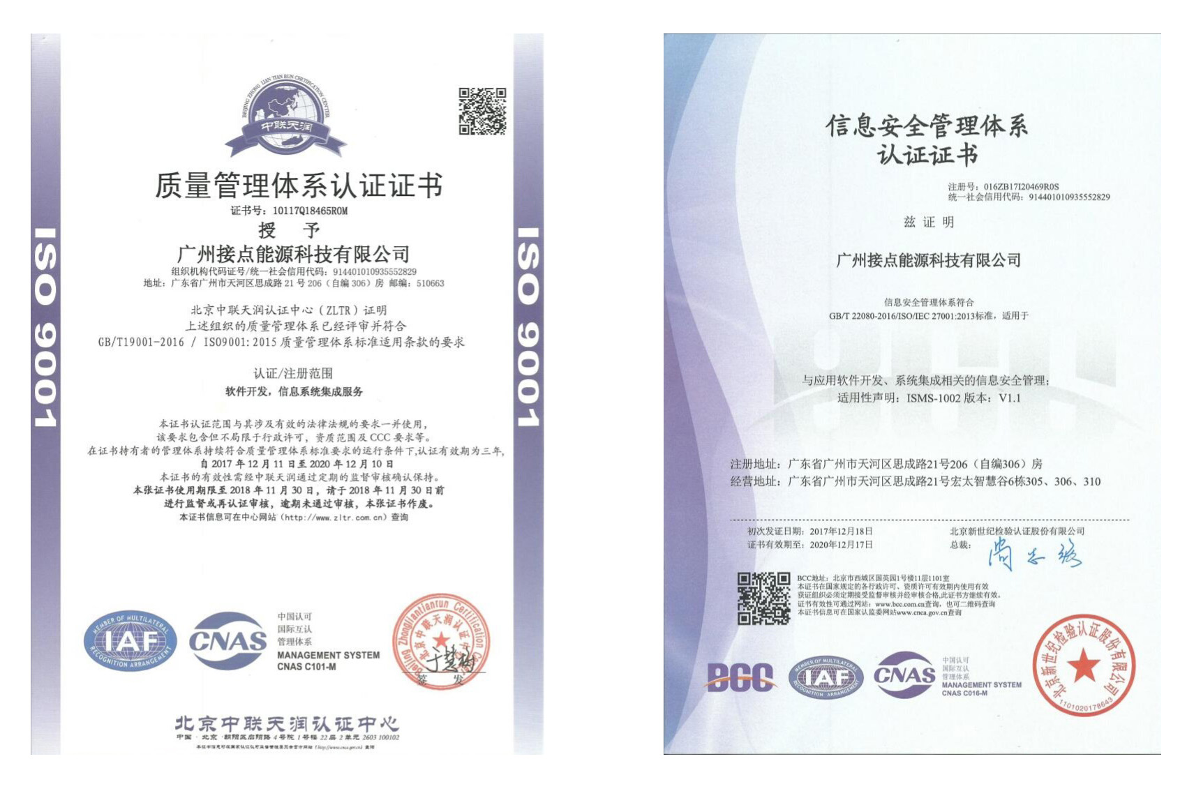 2017年12月,廣州接點能源科技有限公司順利通過了ISO9001:2015質量管理體系與ISO27001:2013信息安全管理體系國際標準認證,標志著接點公司在質量和信息安全管理體系的建設和實施方面均已達到國際標準要求,為公司在軟件開發管理與系統集成服務的質量體系改進和完善奠定了堅實的基礎,也標志著公司有能力為更多用戶提供更安全高更高品質的IT服務。